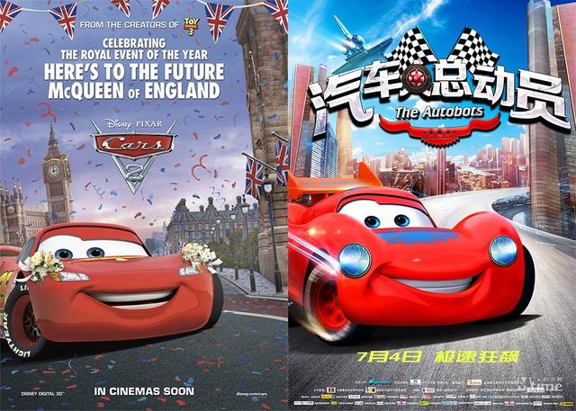 迪士尼知名电影《赛车总动员》(左)与国产动画片《汽车人总动员》(右)海报