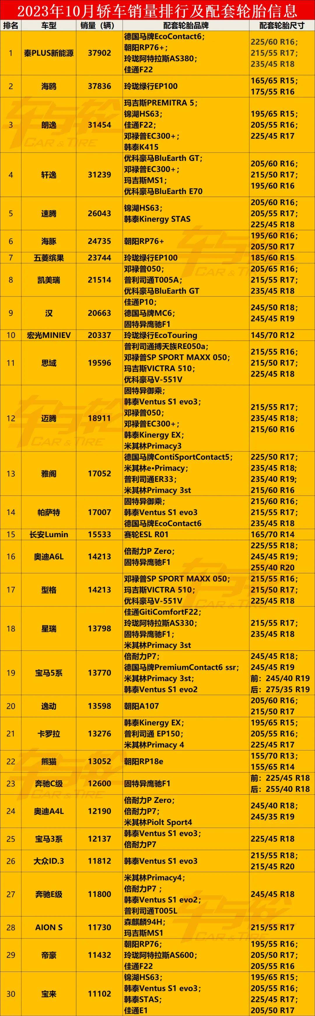 那么这些轿车都配套了哪些轮胎呢?今天,小邦对10月销量前30的车型进行计算,整理了每个车型配套的轮胎斑纹以及尺度,以便我们探究最热销的车型及配套轮胎,对轮胎生意做出合理安排。
