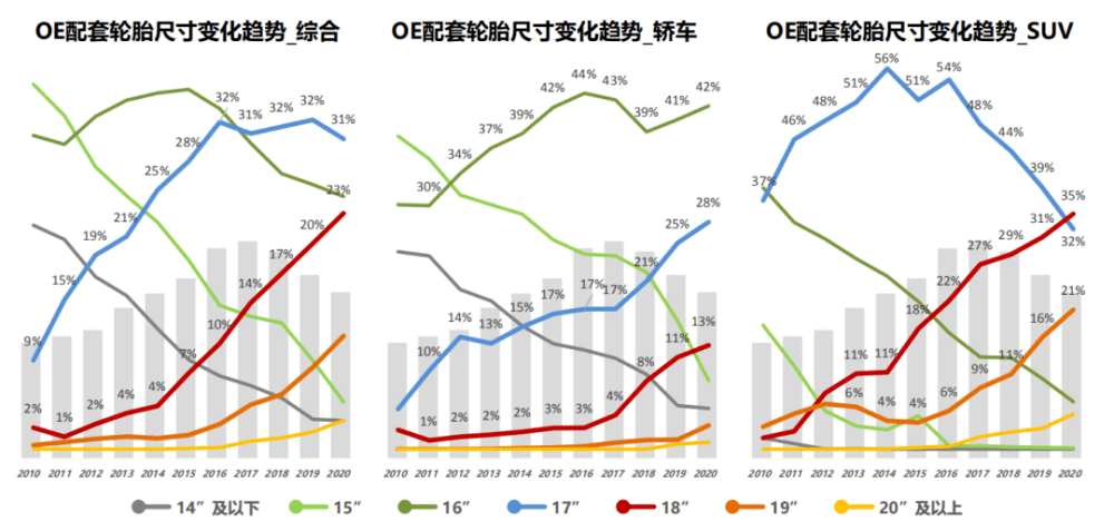稀有据标明,10年间,轮胎商场上17寸-19寸的轮胎销量猛涨,而13-16寸的轮胎销量下滑。