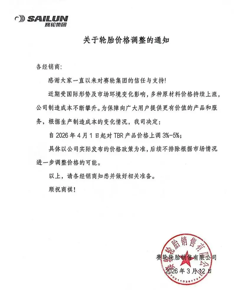 2026年3月12日,轮胎职业提价潮再掀高潮。赛轮集团、通用股份、物资中大、华盛橡胶、优盛轮胎、贵州轮胎等企业同日官宣调价,正式参加此轮提价阵营。其间,赛轮集团宣告自4月1日起,对TBR(全钢载重子午线%。